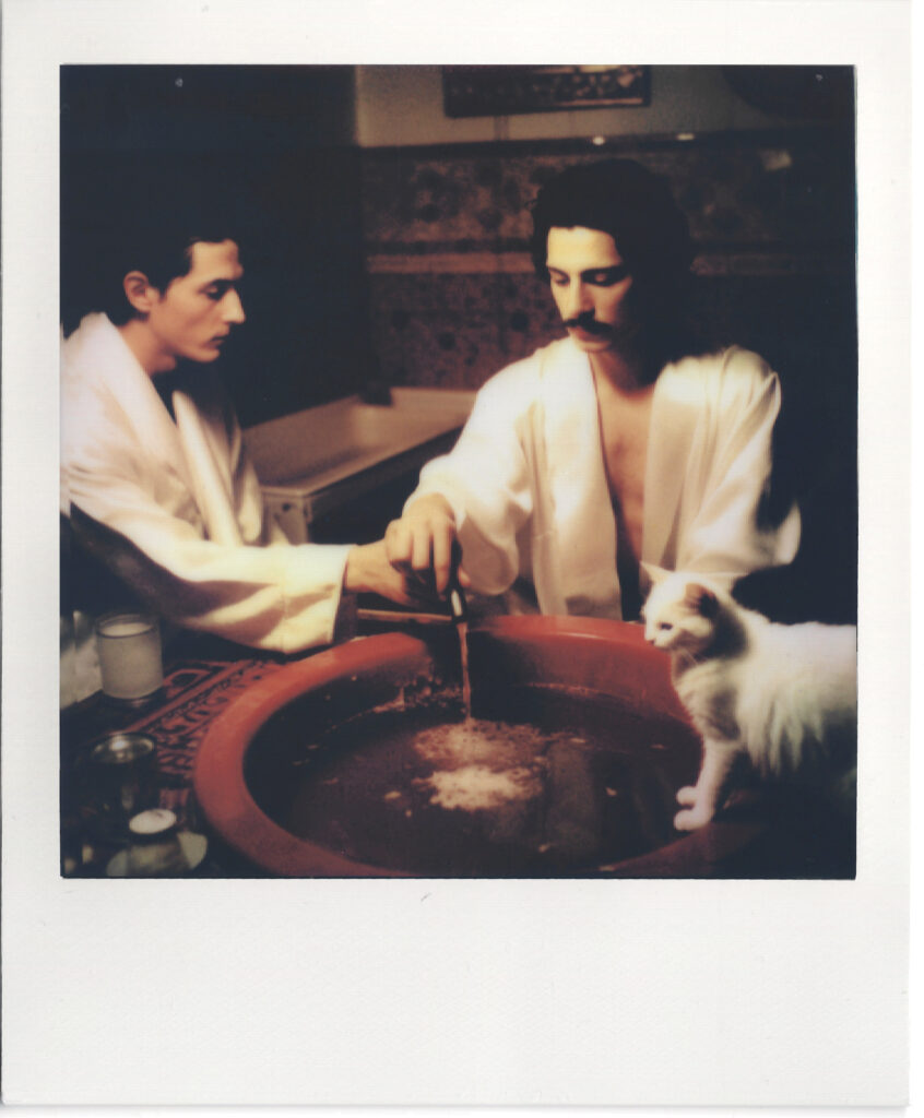 To create the AI Polaroids, Kerem Yavuz teaches Midjourney software how to make an image look gay, glamorous, exotic, romantic, antique, Ottoman, or express other features simultaneously, using his words. He even gets specific in the sense of telling the software, “make this image look like it was shot with a Nikon 110 millimeter lens,” or “give me an image of two men in front of a mosque in Istanbul in the style of Jodorowsky,” and the software generates that effect or visual. Through repeated processes of trial and error, Kerem Yavuz communicates different combinations of these key words to the software until he gets his desired imagery in return – a tedious practice that requires a lot of patience and nuanced communication between man and machine. Each time, the AI software transforms Kerem Yavuz’s permutations of adjectives into generated imagery based on other imagery it has been introduced to previously online. Kerem Yavuz explains, “In photography, we often shoot the same shot hundreds of times with small tweaks and iterations. This also applies to AI-generated imagery, where sometimes Midjourney will give me almost what I’m looking for, but not quite, so I will spend hours telling it to iterate on one specific thing. Sometimes, in both cases, the image just doesn’t work. Or you end up needing to edit in post.” As result of the collaboration between Kerem Yavuz and Midjourney (which actually lives on Discord – a platform he describes comically as “the unholy love child of Reddit and WhatsApp”), the scenarios in the imagery look, to some degree, believable.