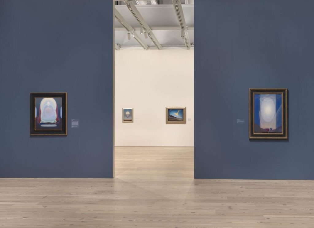 Installation view of “Agnes Pelton: Desert Transcendentalist” (Whitney Museum of American Art, New York, March 13–November 1, 2020). From left to right: Mother of Silence, 1933; Departure, 1952; Awakening (Memory of Father), 1943; Light Center, 1947-48. Photograph by Ron Amstutz. Courtesy of The Whitney Museum of American Art.