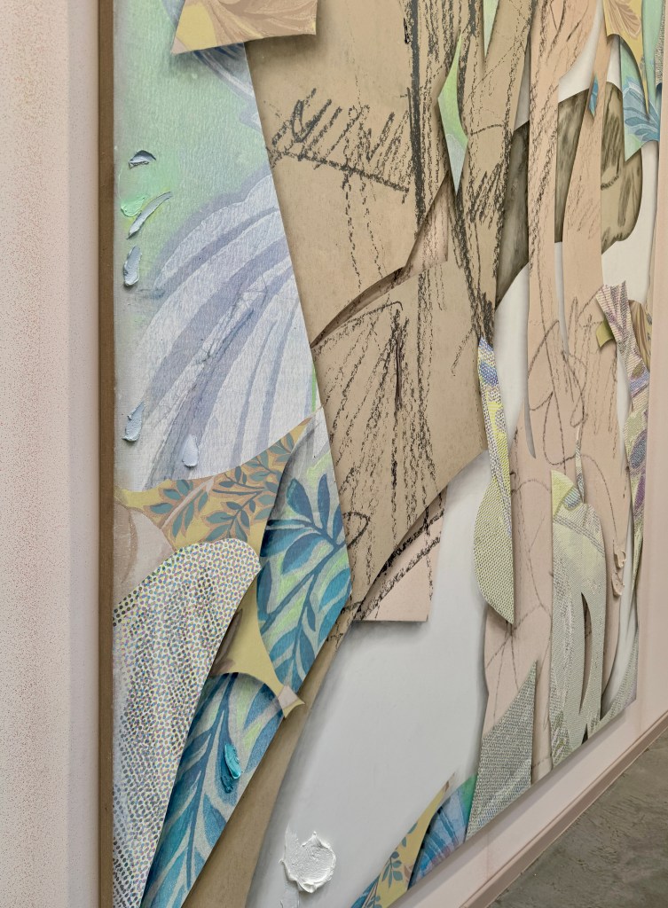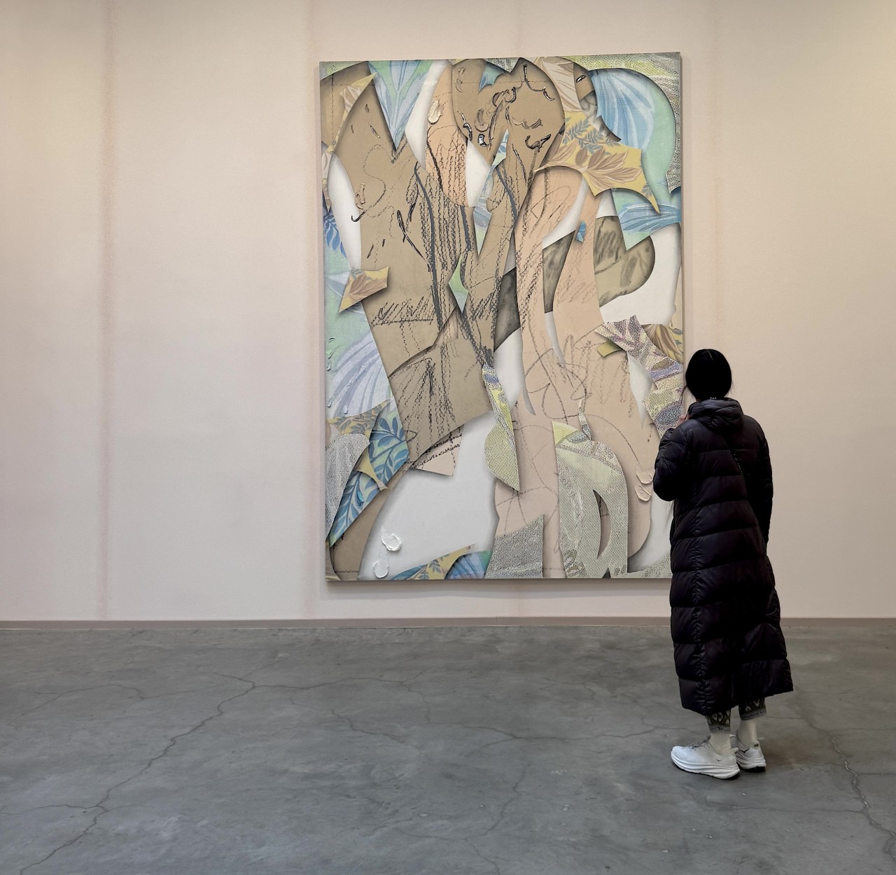 Laura Owens, Untitled (Detail), 2025, Oil, pastel, charcoal, graphite, and silkscreened Flashe on linen, 130 x 90 inches. Photo by Bailey Coleman.