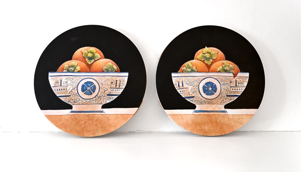 Erin Kono, PersimmonI + II, Egg tempera on shaped board, 9.5 in. tondo each. Courtesy of the curator.