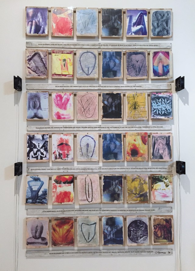 On view through March 11, 2018, Kinetic Painting includes Schneemann’s paintings, sculptures, films, drawings and performances, ranging from interactive social experiments with friends, lovers, and pet cats, to pieces dealing with violence, mourning, grief, sex, gender, and the politics of the female body. For instance, in the below work, Vulva’s Morphia (1995) Schneemann problematizes if womens’ understanding of their own anatomy/physiology is defined in masculine terms.